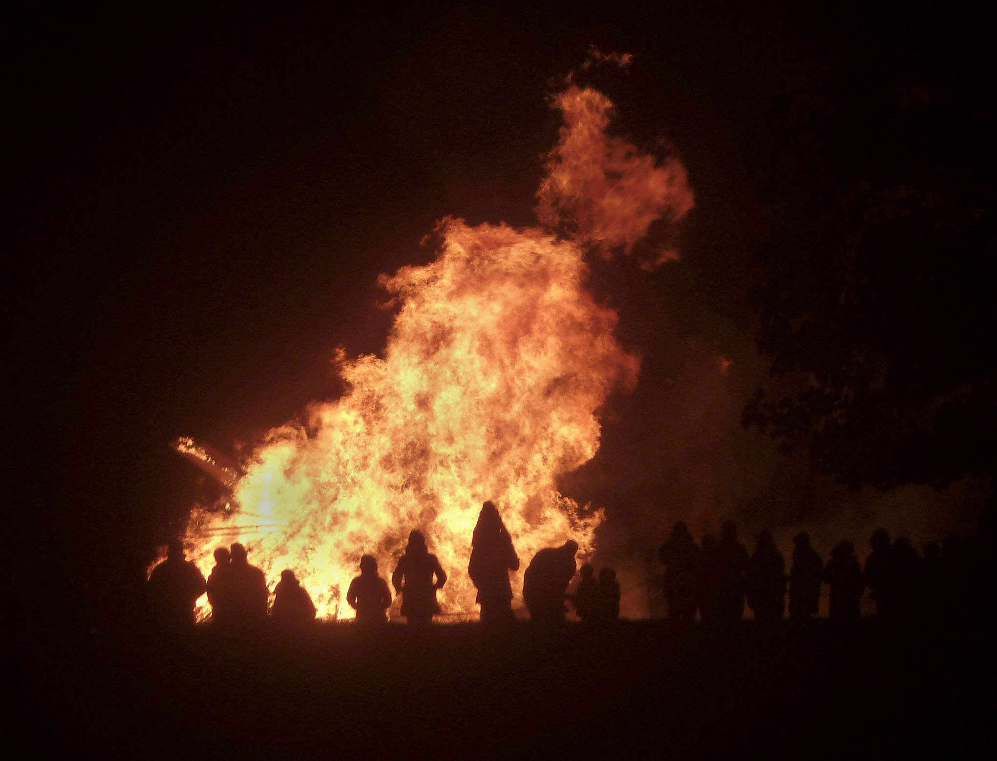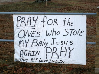 As soon as the lights shut off, young men from one of the large dorms lit a bonfire in the middle of campus. Students flocked to it like moths to a flame. So did campus police. With the cruisers thus occupied, another commando group used bolt cutters to crack the chains which stapled life-sized Nativity figures to the ground. The next morning, campus police spotted one of the wise men and his camel placidly adjusting to life atop the Dining Commons.
