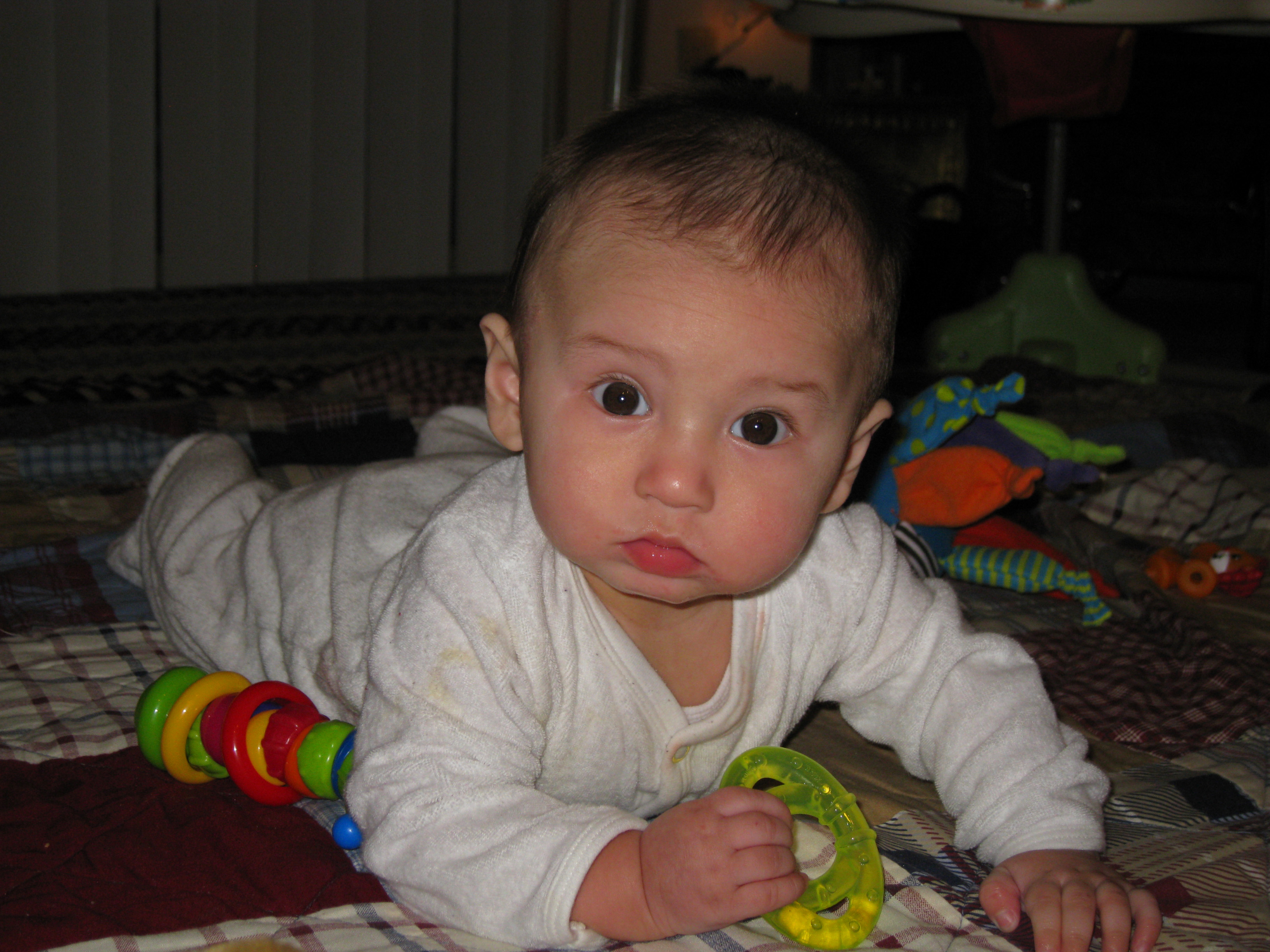 Third, Pearl allowed his infant children [seven months to one-year-old] to play on the edge of a pond on the family property. He would let each child fall in; let them stay underwater until it registered that they couldn’t breathe; and only then rescue them from beneath the water. “It only took one time for each of them to learn respect for the water,” Pearl writes. “And it sure made life easier for us.” The only exception was his highly coordinated seven-month-old daughter Shalom, who just wouldn’t fall into the water on her own. So—you guessed it—Pearl pushed her in with his foot so that she felt that she was drowning. Nothing else would accomplish Pearl’s purposes of instilling terror of the water so Shalom wouldn’t play near the pond. I have included a picture of my almost seven-month-old son, Oliver, so you can see what age Shalom was when Pearl kicked her into the pond. Is this something God would approve of, do you think? Yet Pearl provides it as a shining example of child “training.”