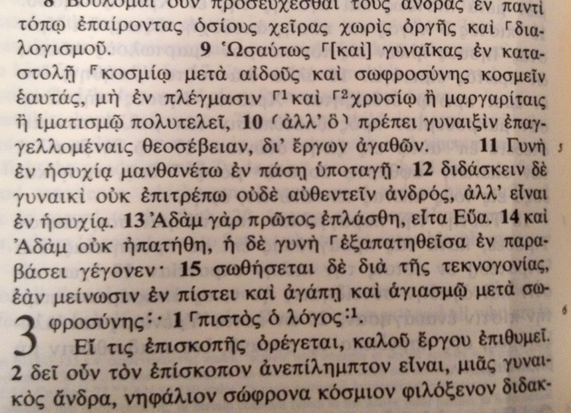 • Thanks, David! I just read through Kostenberger’s analysis. It is quite interesting. But syntax alone can’t determine the meaning of a word–as you say in the paper, context also plays a decisive factor. It is that context I tried to bring out in the post above, since most folks have never read anything about the background to 1 Timothy, the city of Ephesus, or the cult of Artemis. Thanks for adding these important links to the conversation–I hope readers of this post will also take some time to peruse them and consider the arguments. My goal is to open dialogue, not squelch it =)